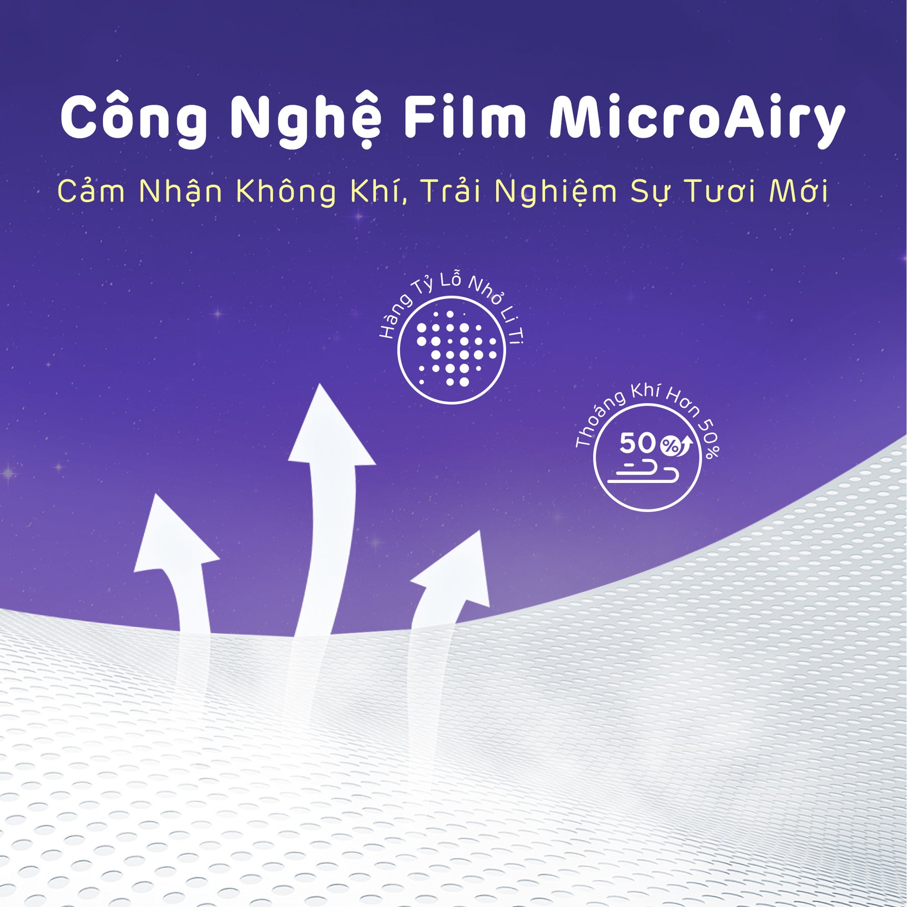 - Hàng triệu lỗ thông khí siêu nhỏ, tự động giải phóng không khí ngột ngạt và ẩm ướt, giúp bạn luôn cảm thấy thoáng mát và dễ chịu